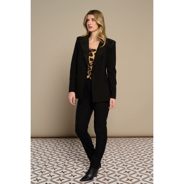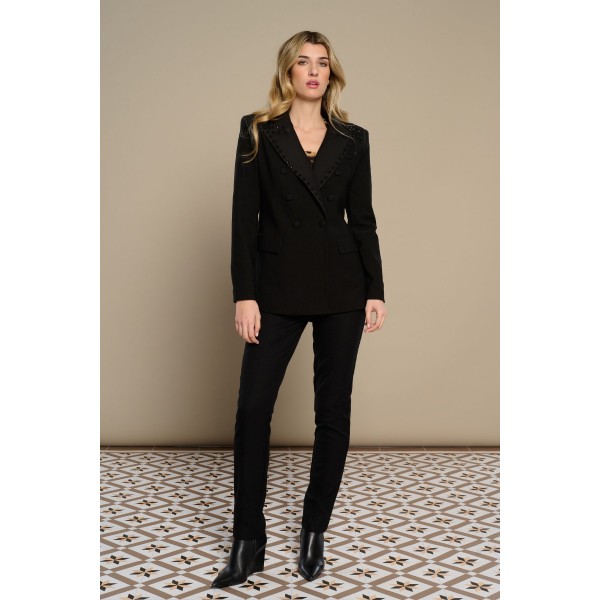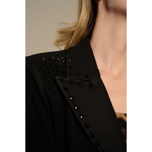 Chaqueta estilo blazer con detalles de strass negro en hombreras y solapa. Cierre con botones frontales. Bolsillos en laterales. Forro interior.