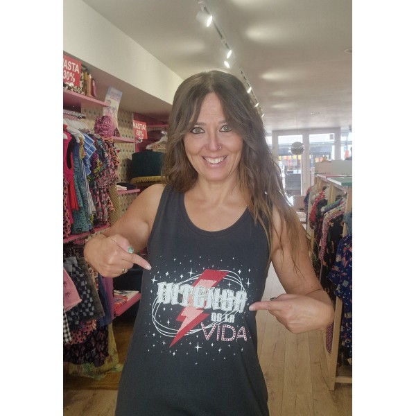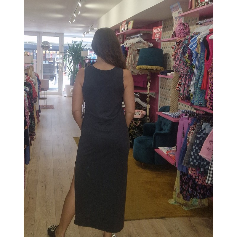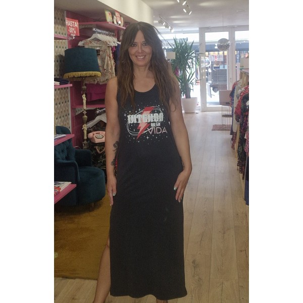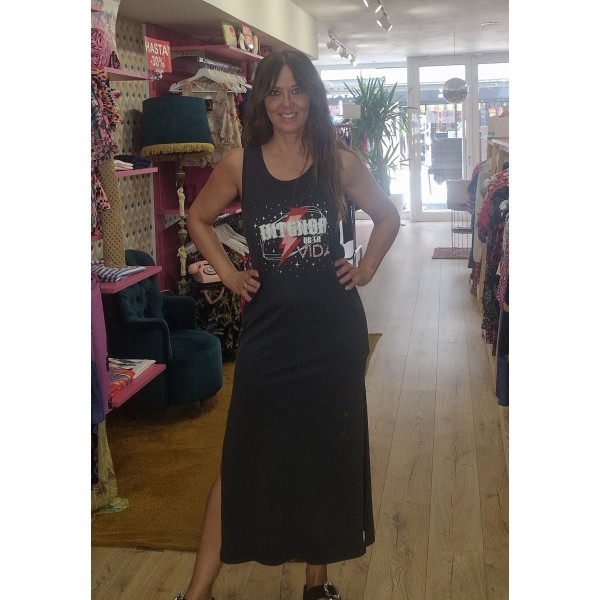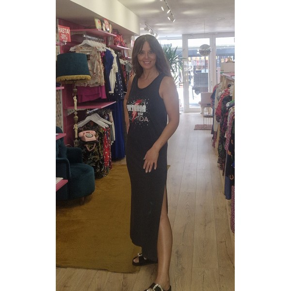 Vestido de tirante ancho, largo midi con aberturas laterales. Color negro fade out. Detalle de topitos en rojo con glitter en la palabra VIDA.