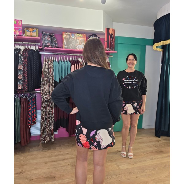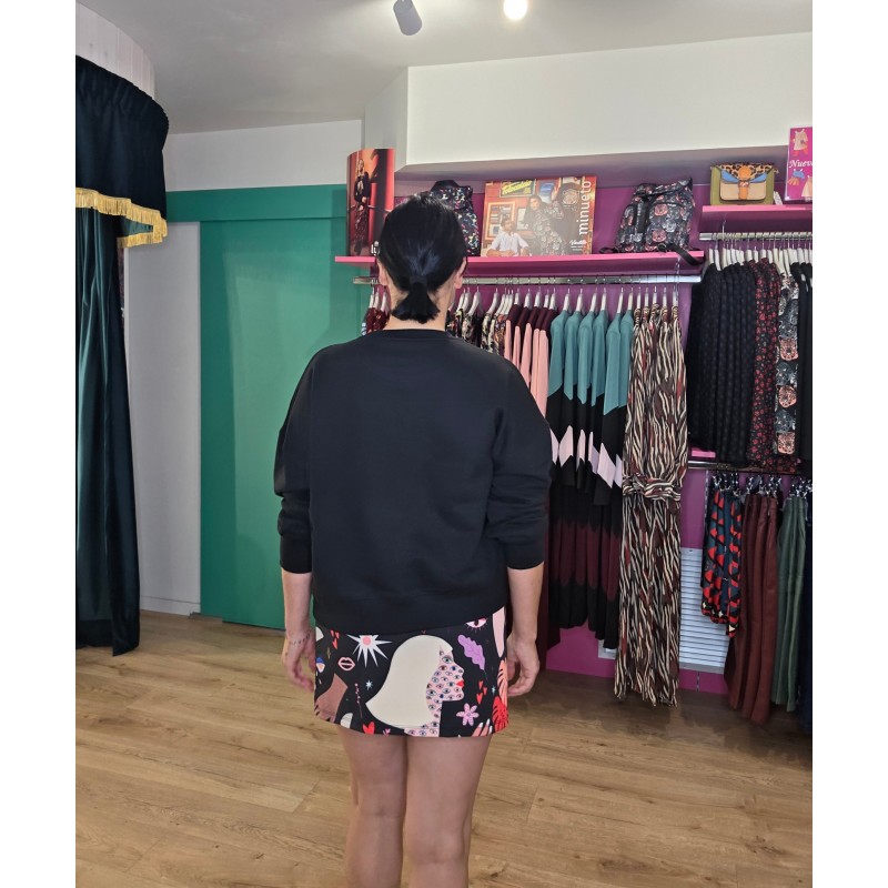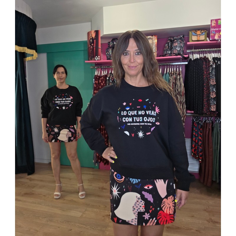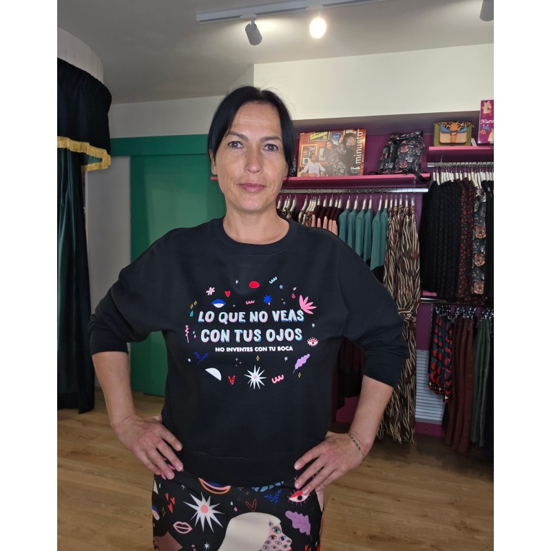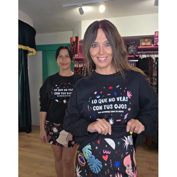 Sudadera negra afelpadita rollo over con mensaje que pone LO QUE NO VEAS CON TUS OJOS NO INVENTES CON TU BOCA.