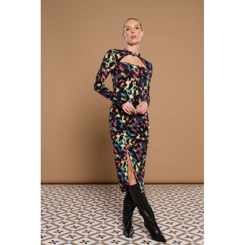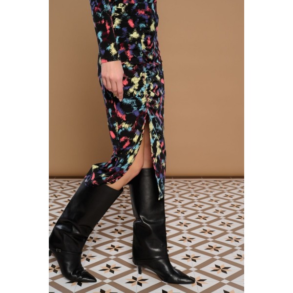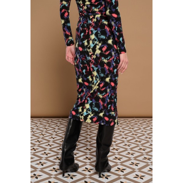 Falda midi de tiro alto con fruncido y drapreado lateral. Estampado animal print. Tejido elástico. Forro interior elástico.