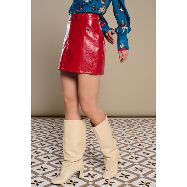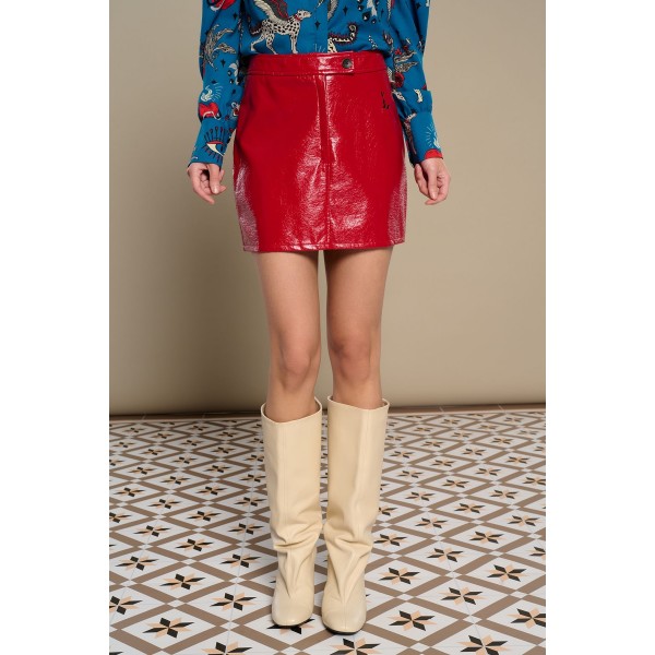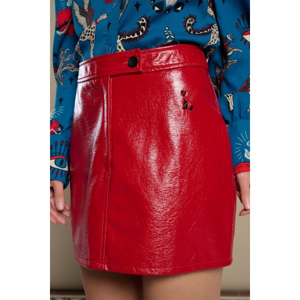 Falda mini de tiro medio de charol. Logo bordado en lateral. Forro interior.