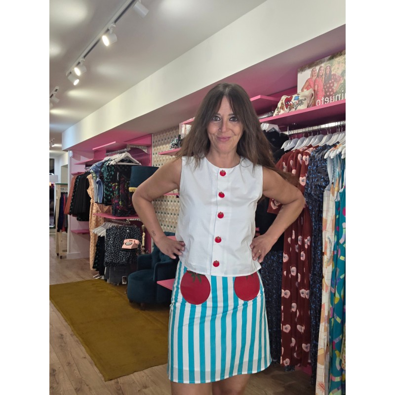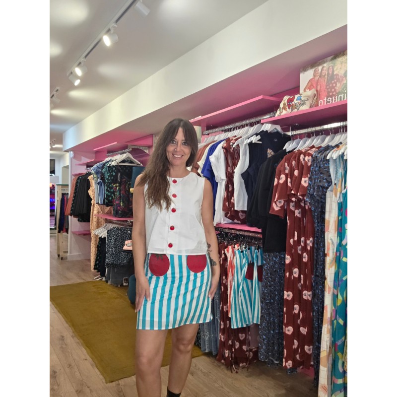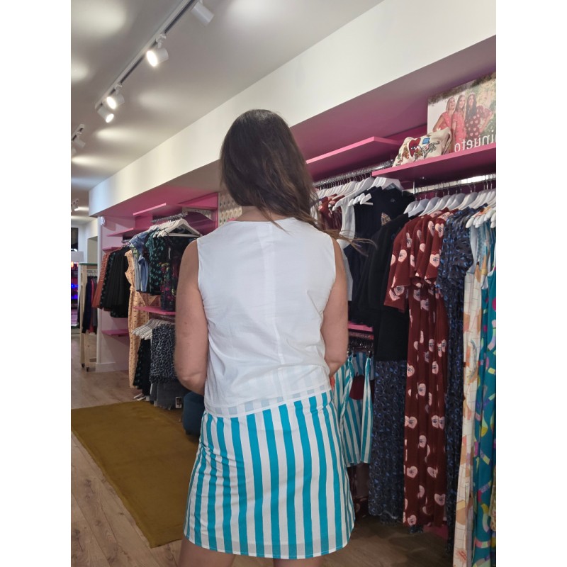 Falda de listas azules y blancas que cierra con cremallera.