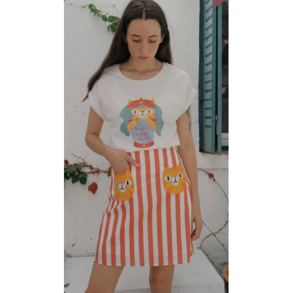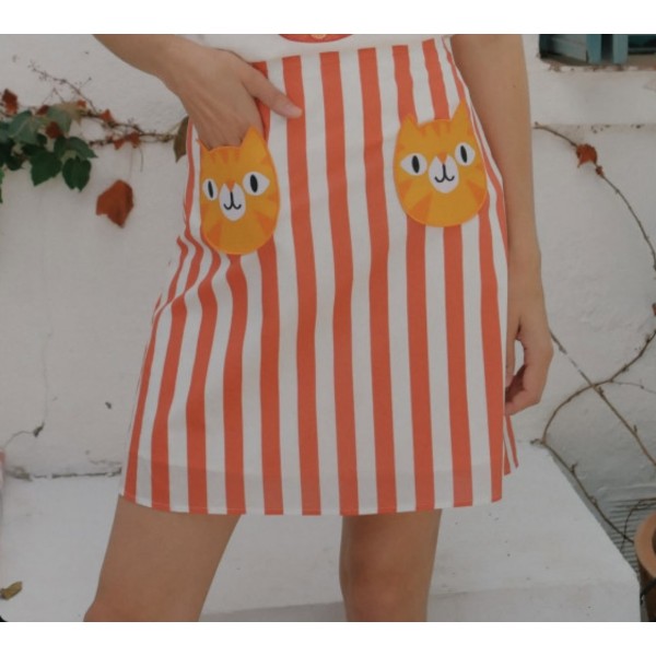 Falda 100 % Viscosa con estampado de rayas en color coral y blanco.