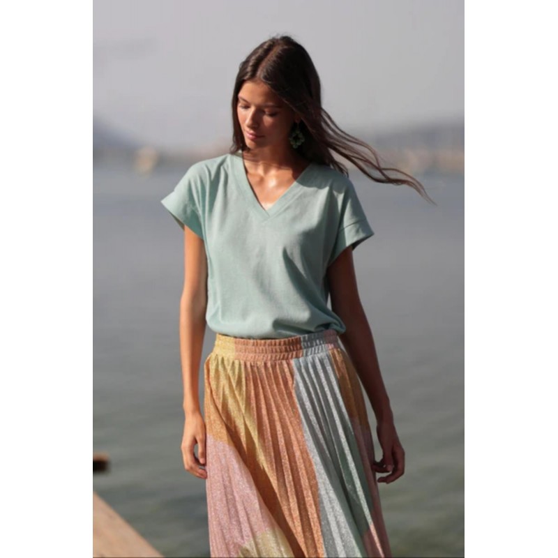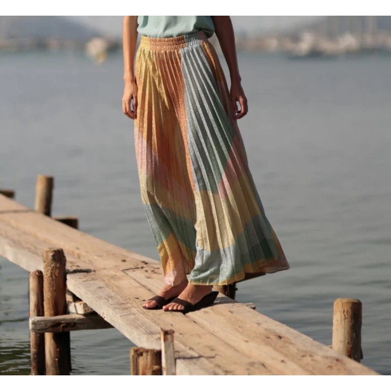 La falda presenta un delicado plisado soleil que nace de una cómoda cintura elástica, ensanchándose gradualmente para ofrecer un vuelo espectacular y una caída fluida. El diseño se enriquece con un patrón de grandes bloques geométricos y formas circulares que se entrelazan de manera armónica, creando una narrativa visual moderna y artística. Confeccionada en un tejido ligero con hilos brillantes integrados, es la opción perfecta para combinar con un top minimalista y dejar que el movimiento y el brillo de la falda sean los verdaderos protagonistas.