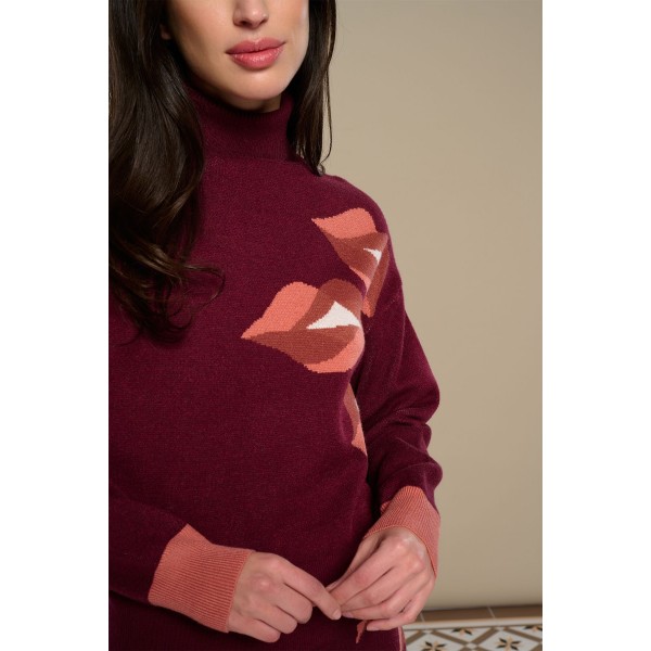 Jersey de punto con cuello redondo y manga larga. Cuello, cintura y mangas en rib. Estampado labios. Tejido elástico.