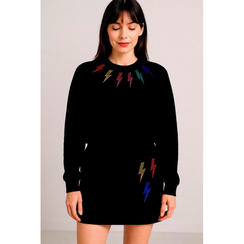 Añade un toque de energía y estilo a tus looks con nuestra sudadera oversize con rayos glitter. Confeccionada en un suave tejido de algodón, esta prenda combina comodidad y diseño gracias a su silueta amplia y relajada. Los bordados de rayos en glitter multicolor situados en el cuello y la parte inferior aportan un aire divertido y moderno, perfecto para destacar en cualquier ocasión.