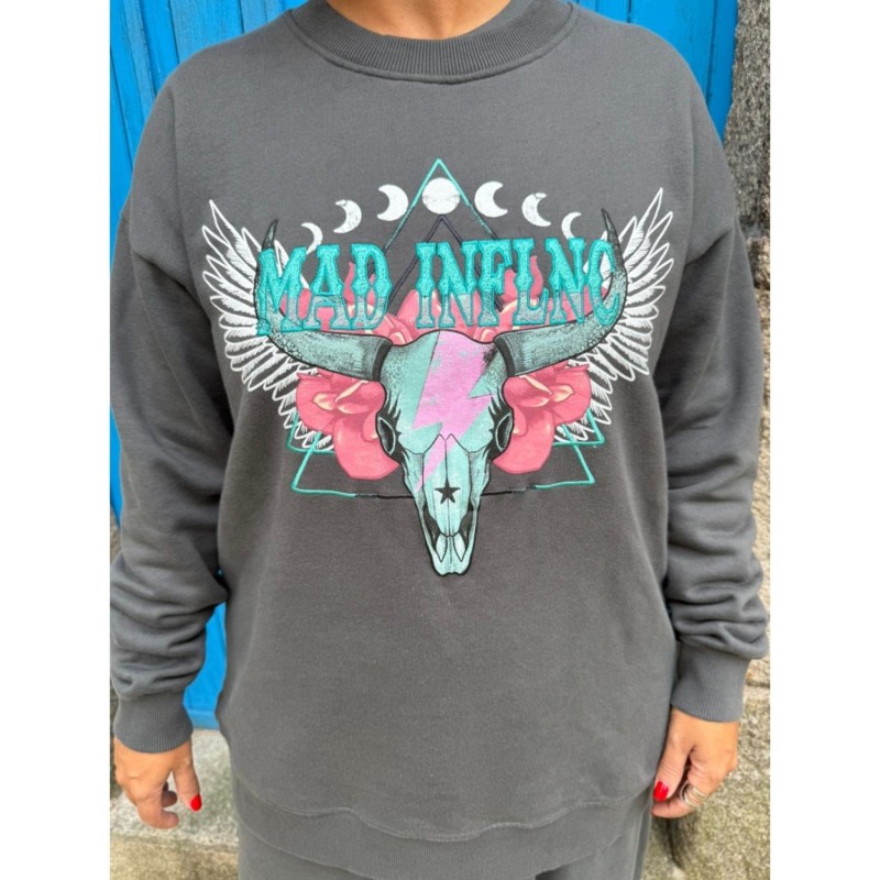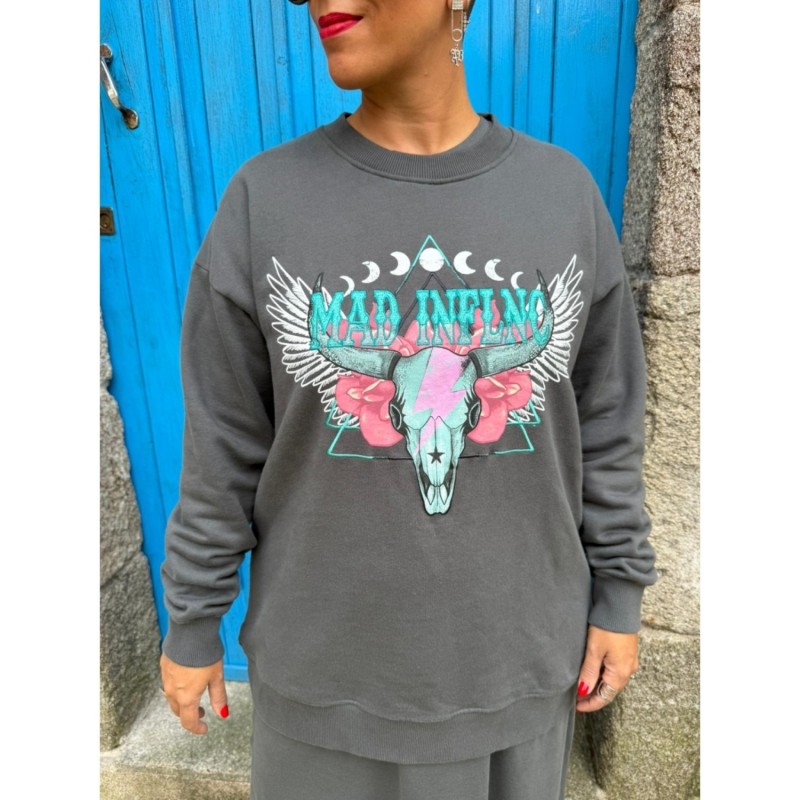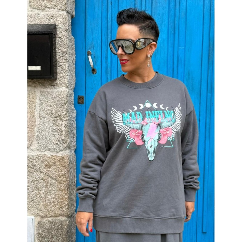 Sudadera larga con felpa interior, ilustración bordada y serigrafía da en colores muy llamativos, color gris plomo