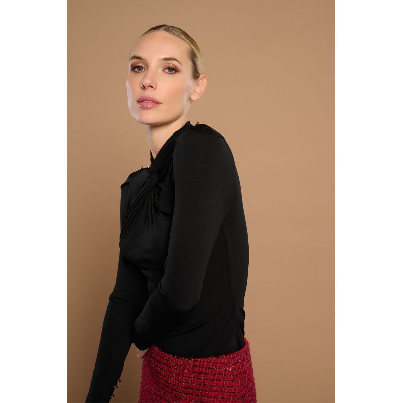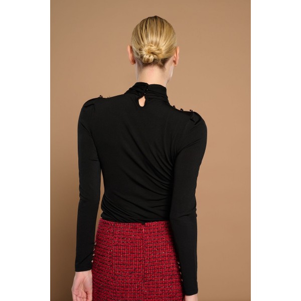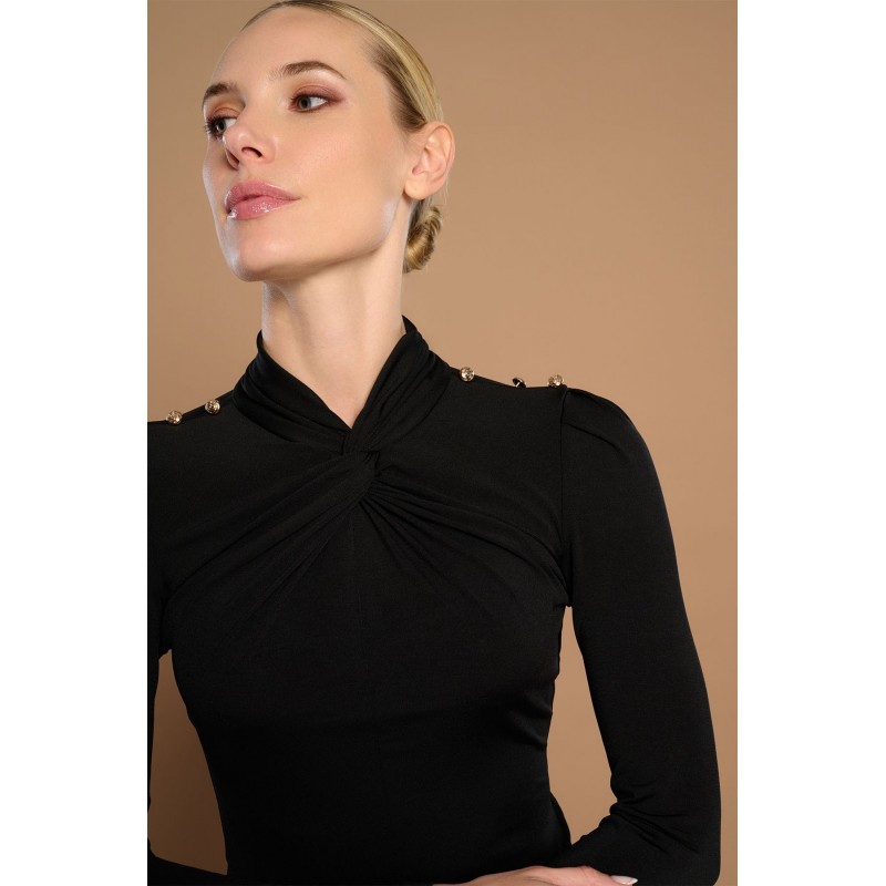 Camiseta de manga larga y cuello perkins en pico. Detalle de botones en hombros. Tejido elástico. Cierre en espalda con abertura y botón.