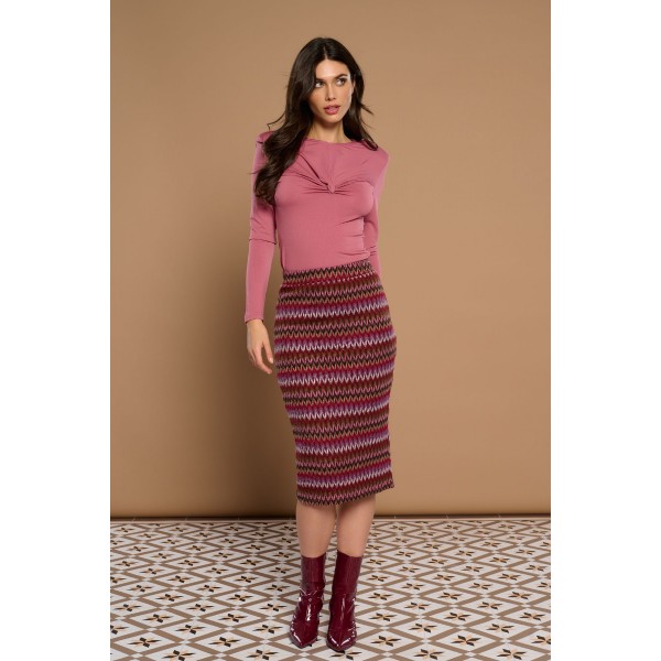 Camiseta de cuello redondo y manga larga. Detalle de nudo en frontal. Tejido elástico.