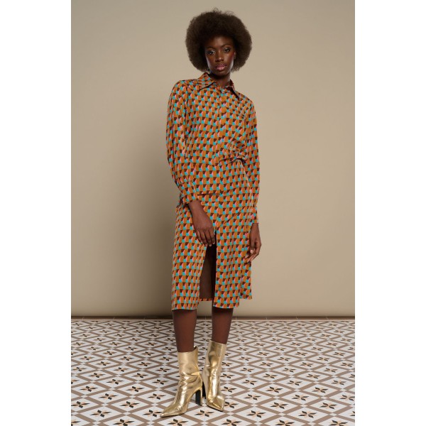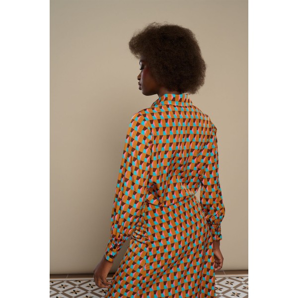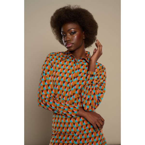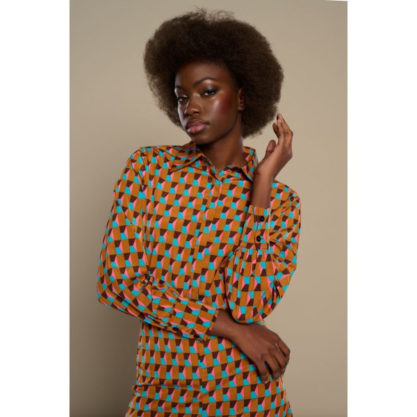 Camisa con cuello solapa y manga larga acabada en puño. Cierre con botones frontales ocultos con solapa. Estampado geométrico.