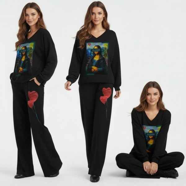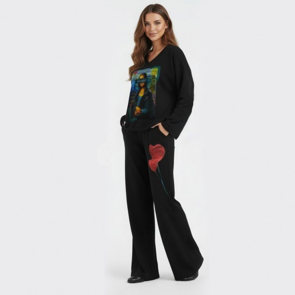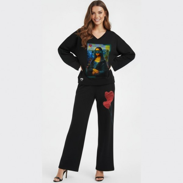 Sudadera negra de corte oversize con cuello pico en rib, manga ligeramente acampanada y aberturas laterales.