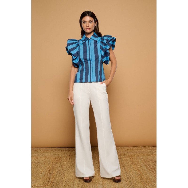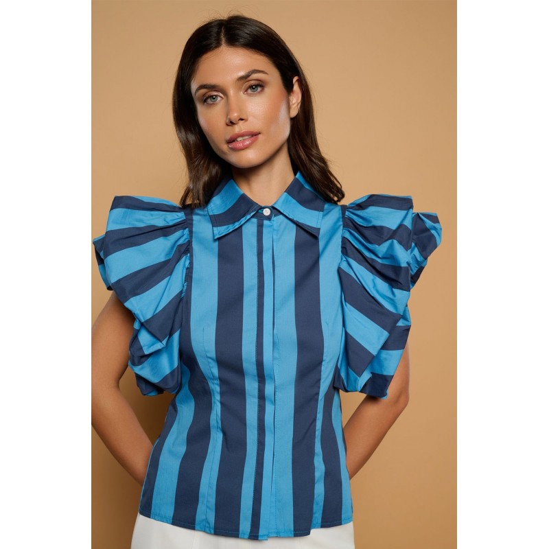 Camisa de mezcla de algodón con cuello solapa y manga corta abullonada con volantes. Cierre frontal con botones.