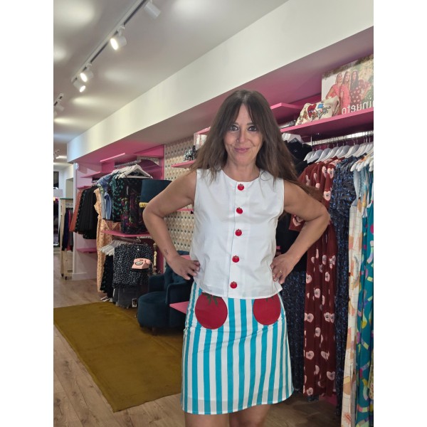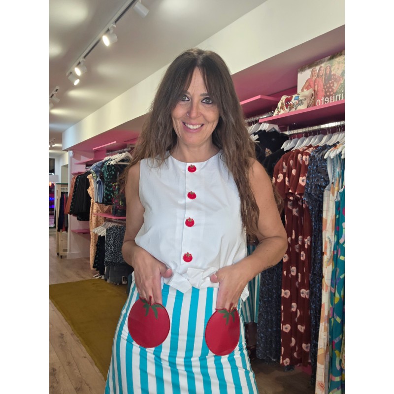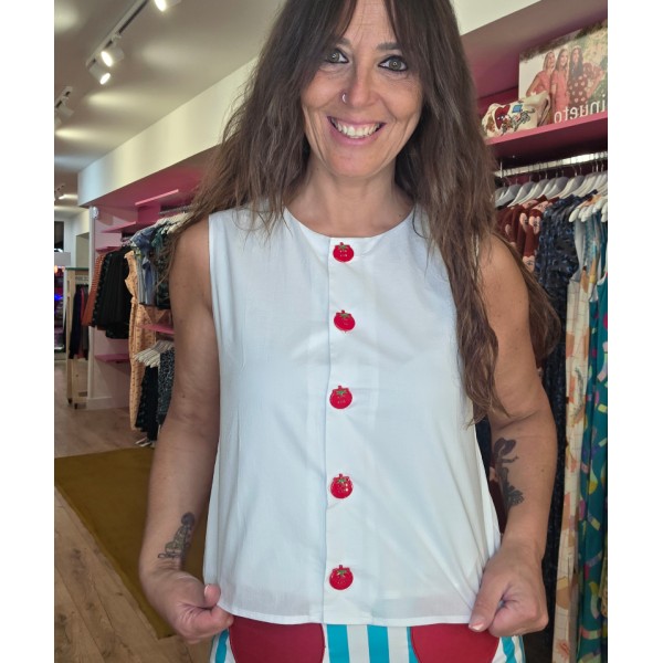 TOP DE TIRANTES BLANCO DE ALGODÓN CON ORIGINALES BOTONES EN FORMA DE TOMATE.