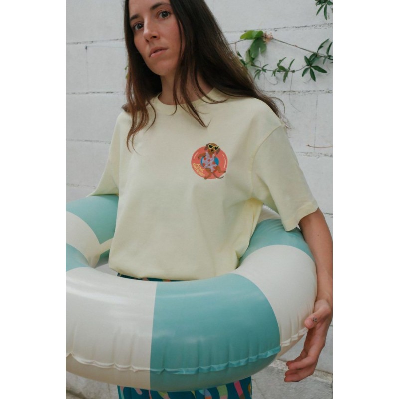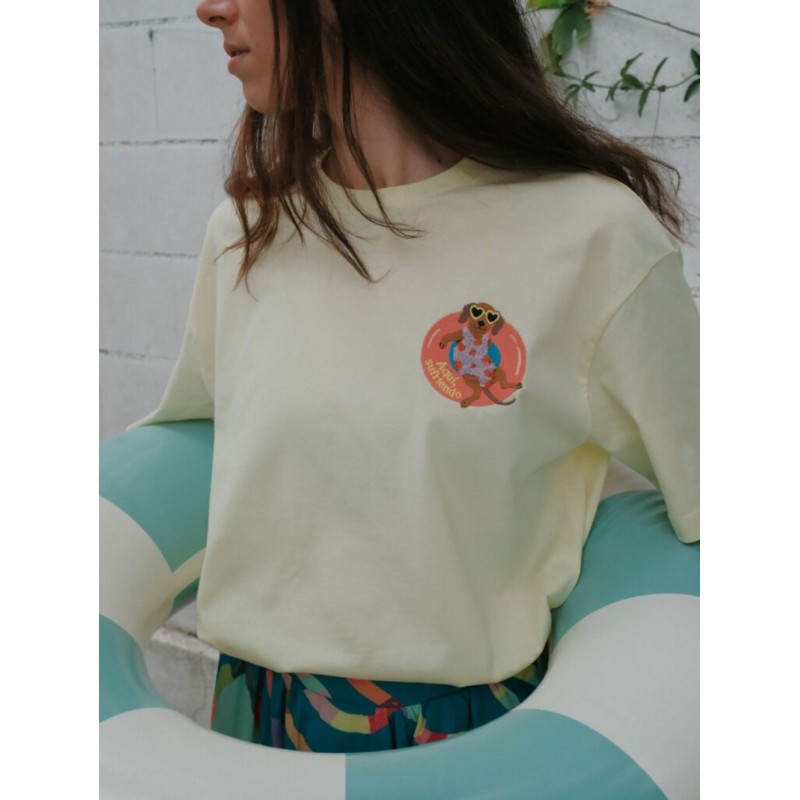 Camiseta amarillo pastel de manga corta con un bordado de un perrito con flotador que pone AQUI SUFRIENDO.