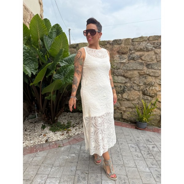 Vestido de encaje elástico en crudo con forro en algodón 100%.