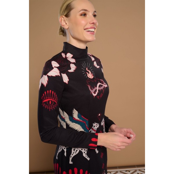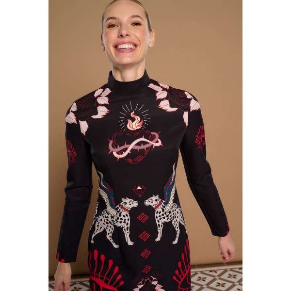 Vestido de cuello perkins y manga larga. Estampado místico. Forro interior. Cierre con cremallera oculta en costura.