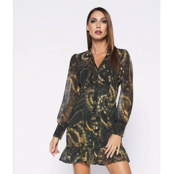Vestido de gasa en tonos verdes con volante en la parte inferior.