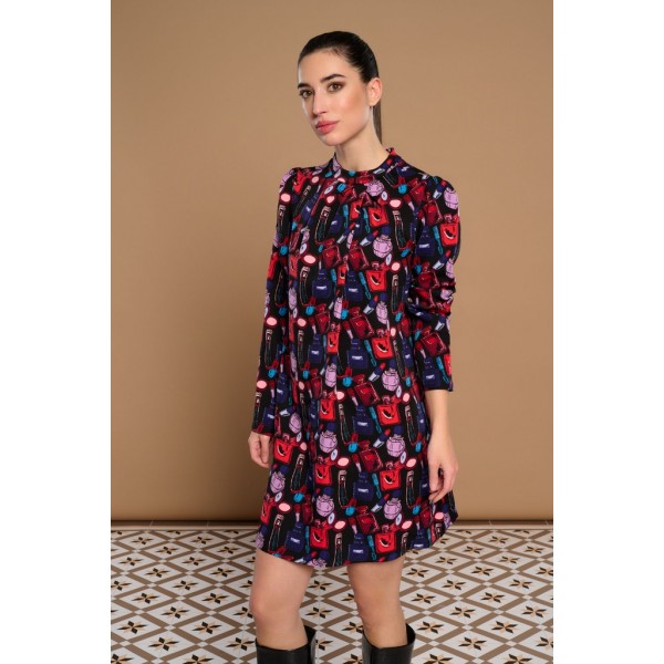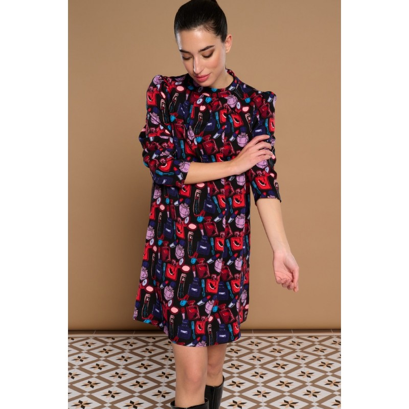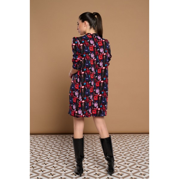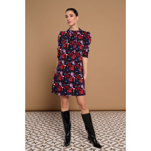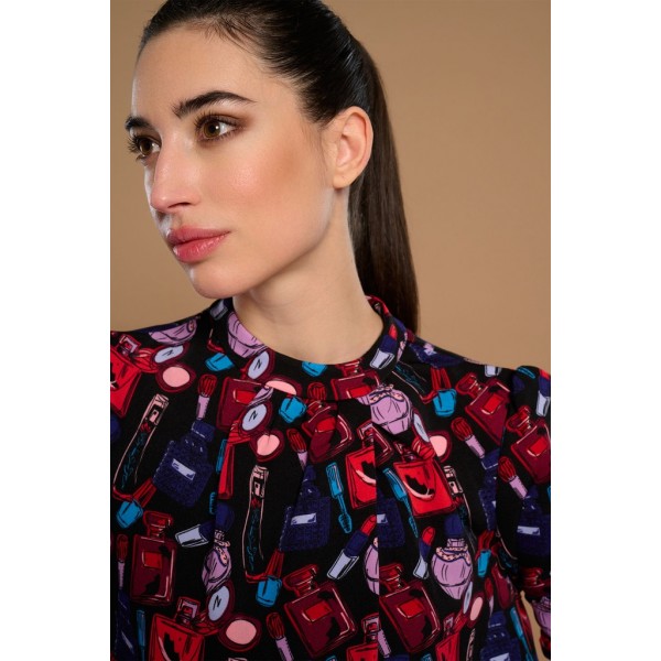 Vestido evasé con fondo negro y estampado de maquillajes en diferentes tonos.