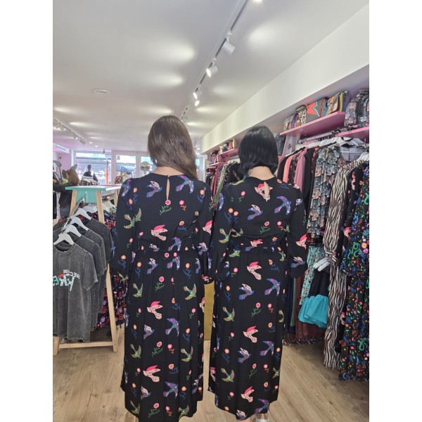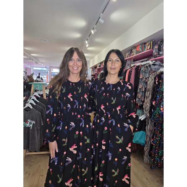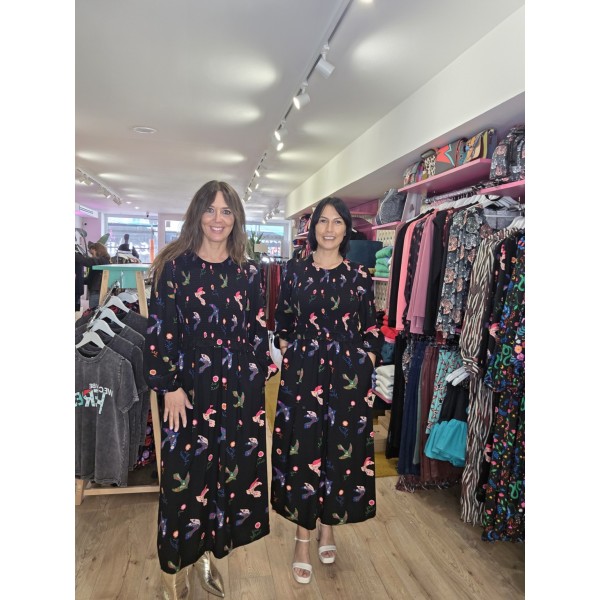 El vestido Darcie llegó para alegrar tu día y tu armario. Cubierto de vibrantes pájaros de arte popular y florecientes flores, este vestido midi se centra en detalles que te harán sentir bien sobre una base negra clásica. Presenta un corpiño bellamente fruncido, mangas largas con un volumen suave y una favorecedora falda fruncida con bolsillos. Un delicado cierre de ojal en la espalda le da un acabado sutil. Combínalo con botas o con zapatillas para un look más informal: Darcie es un acierto seguro para cualquier ocasión.