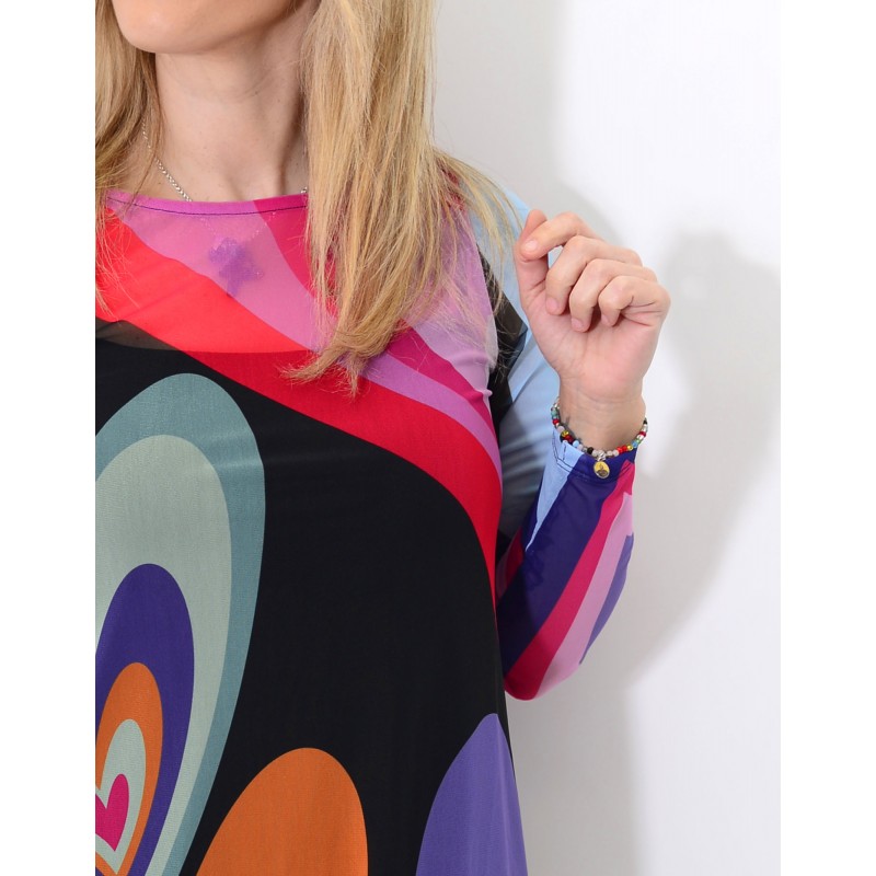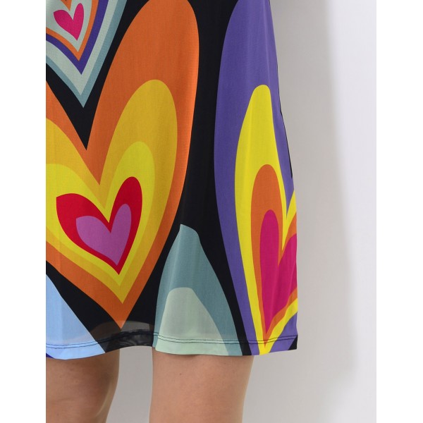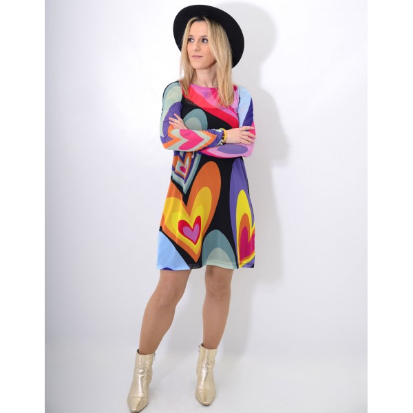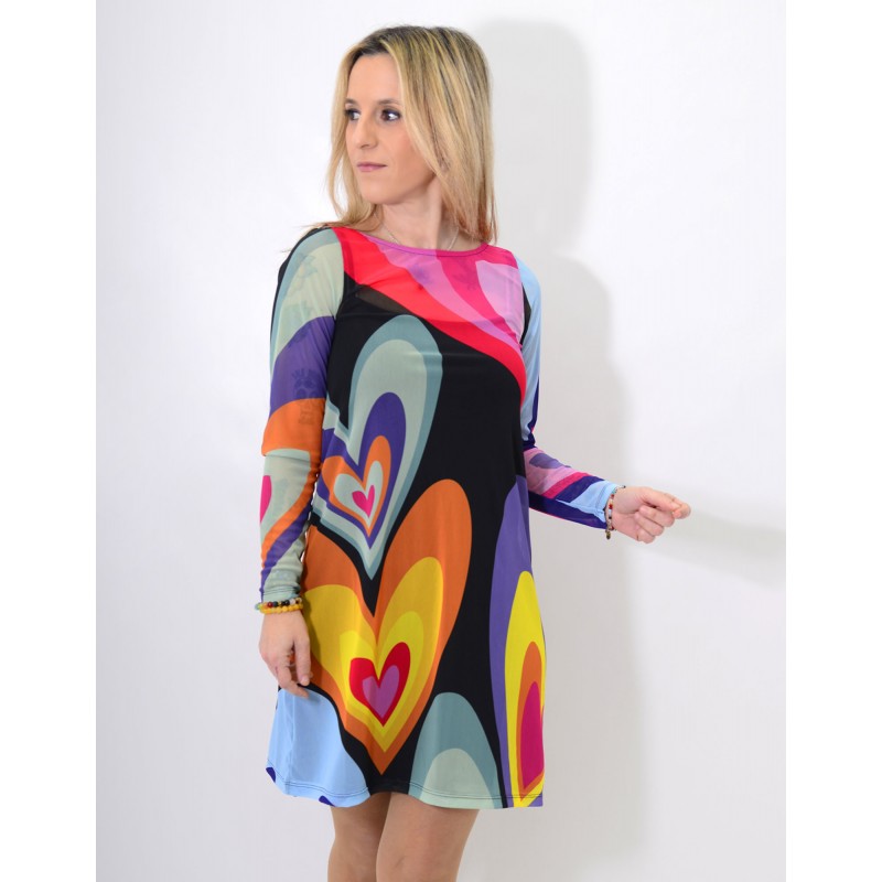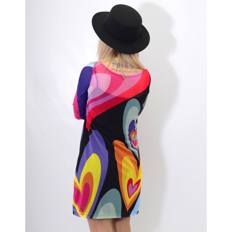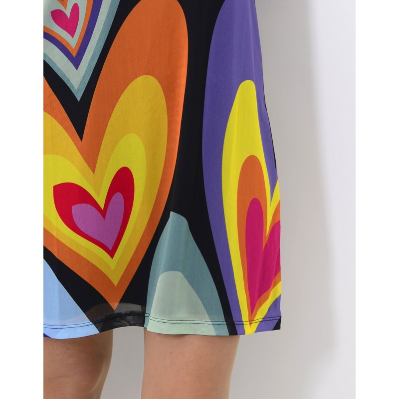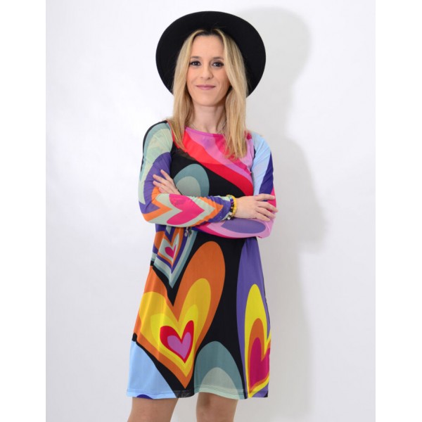 Fondo negro, con print de corazones de colores. Interior con forro sin mangas de color negro.