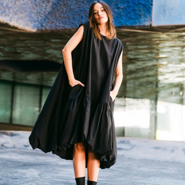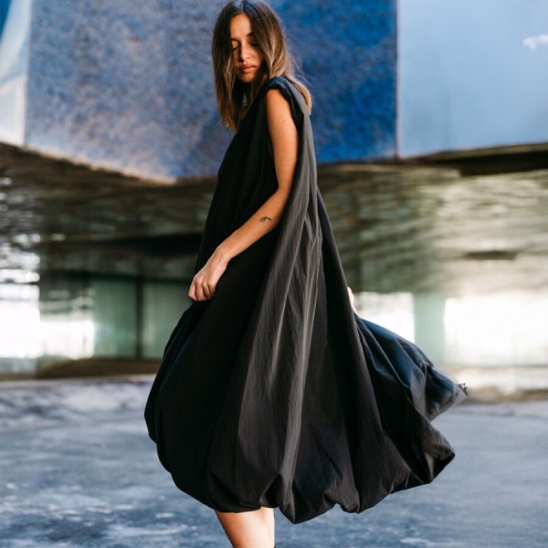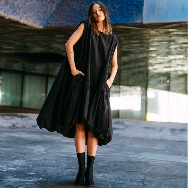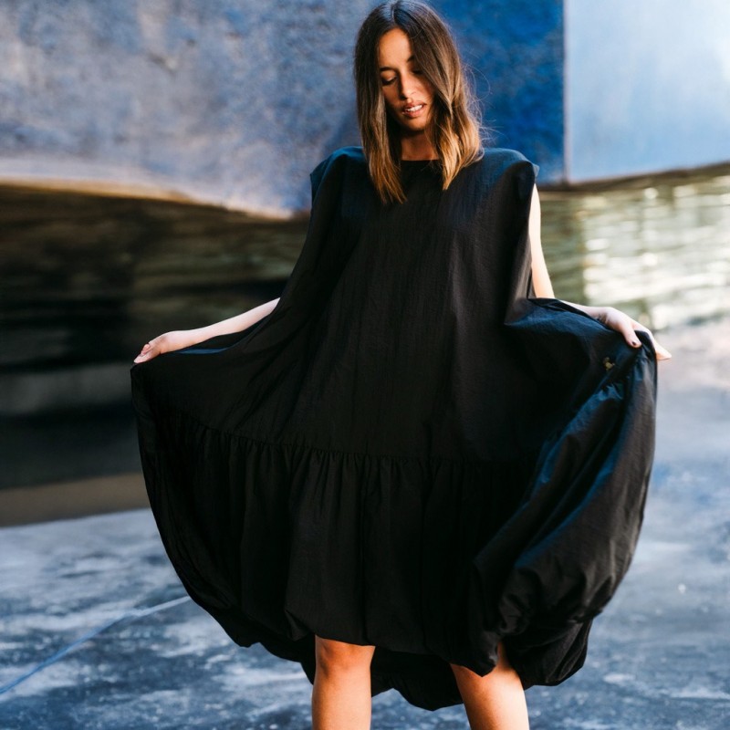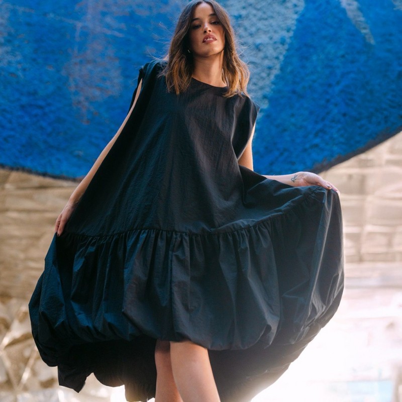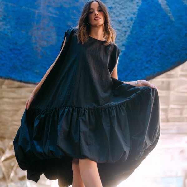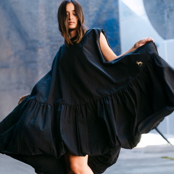 Un homenaje a las mujeres que caminan con seguridad, que entienden la elegancia como una actitud y que no necesitan permiso para destacar.Su silueta envolvente se mueve con libertad, creando un juego de volúmenes que atrapa la mirada desde cualquier ángulo. Confeccionado en un exquisito tafetán negro de efecto arrugado, su tejido posee un carácter escultórico y un tacto suave y delicado, tan agradable como poderoso.