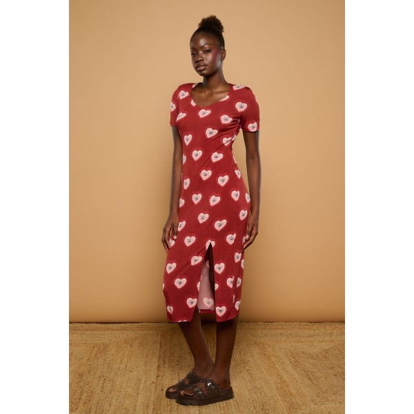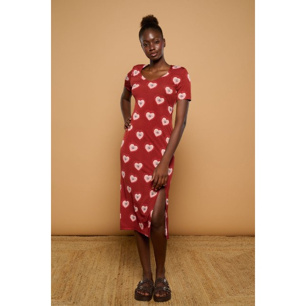 Vestido midi de cuello en pico y manga corta. Abertura lateral. Estampado de corazones "mystic". Tejido elástico.