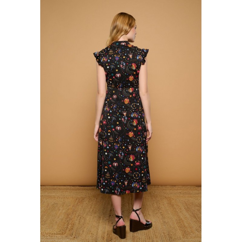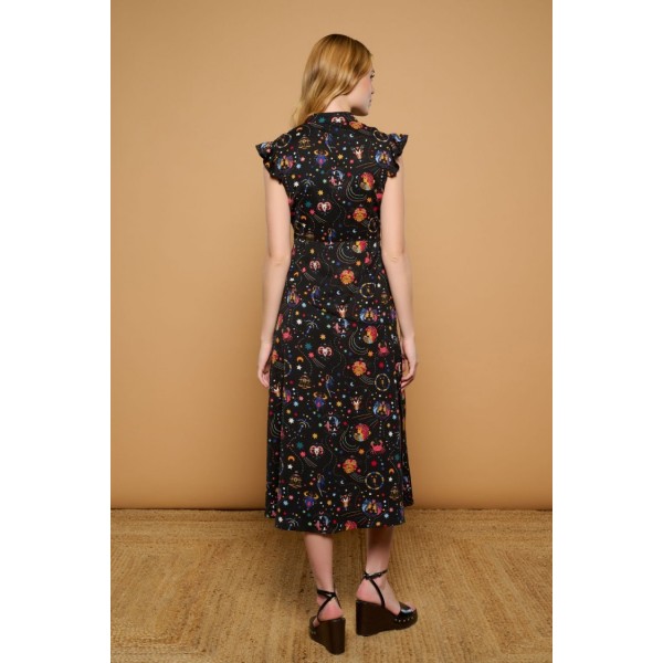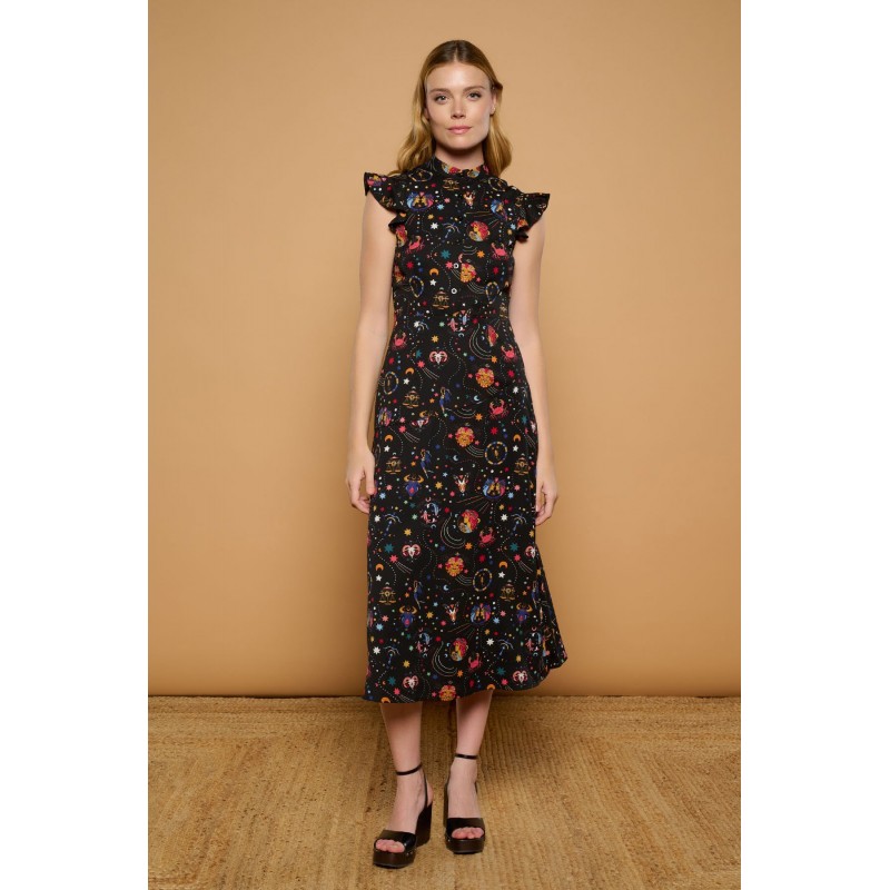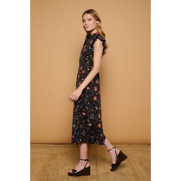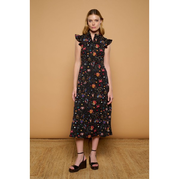 Vestido negro midi camisero de cuello mao y manga sisa con volantes. Estampado multicolor de motivos astrológicos. Ajustado a cintura. Falda corte evasé.