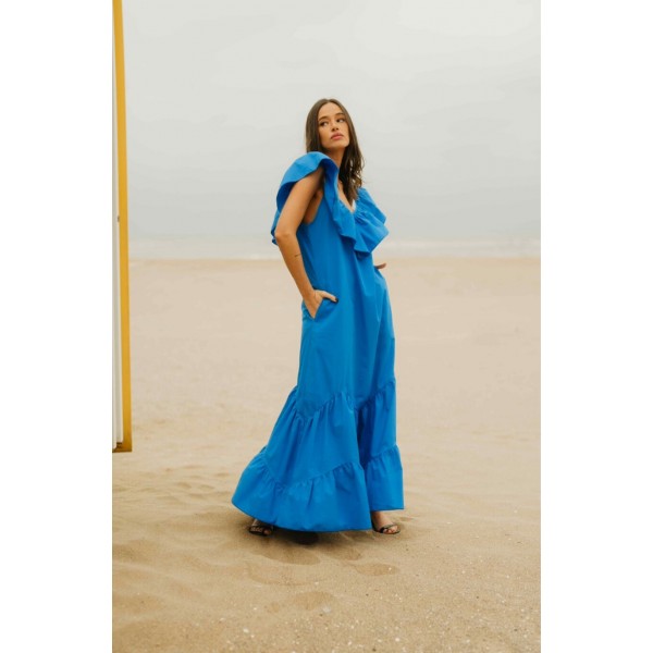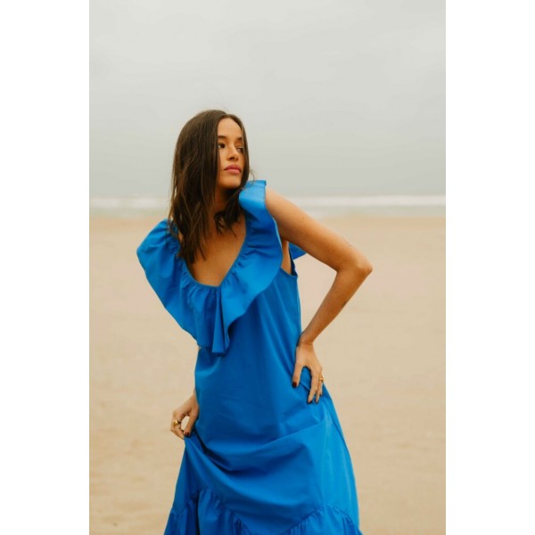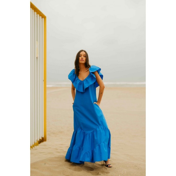 Un azul intenso y vibrante que añade personalidad y fuerza al vestido, evocando el profundo color del mar Mediterráneo.