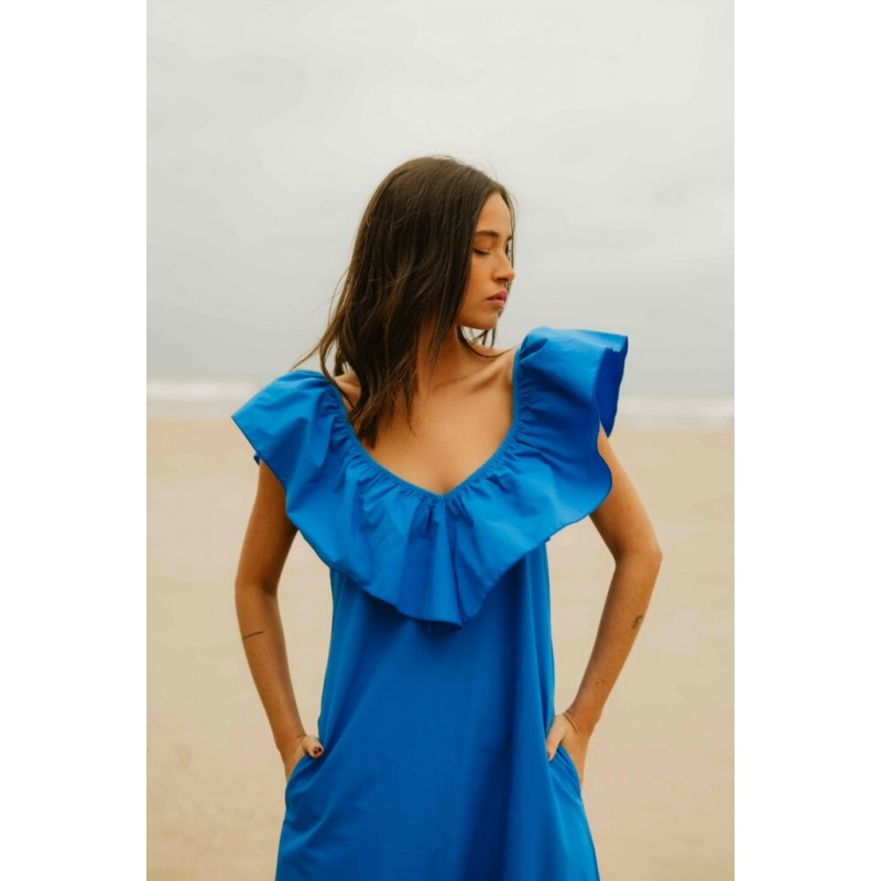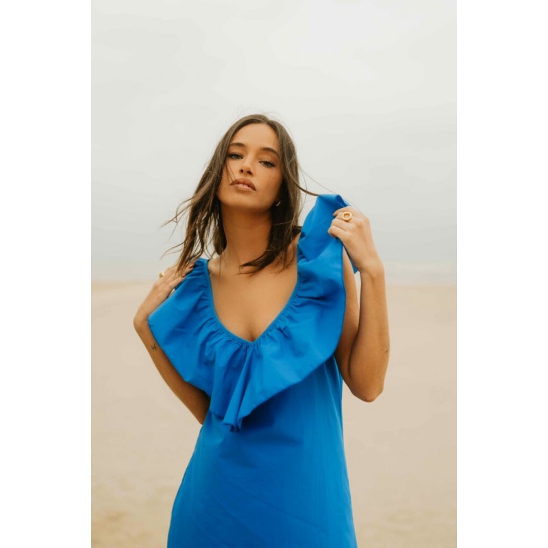 Un azul intenso y vibrante que añade personalidad y fuerza al vestido, evocando el profundo color del mar Mediterráneo.
