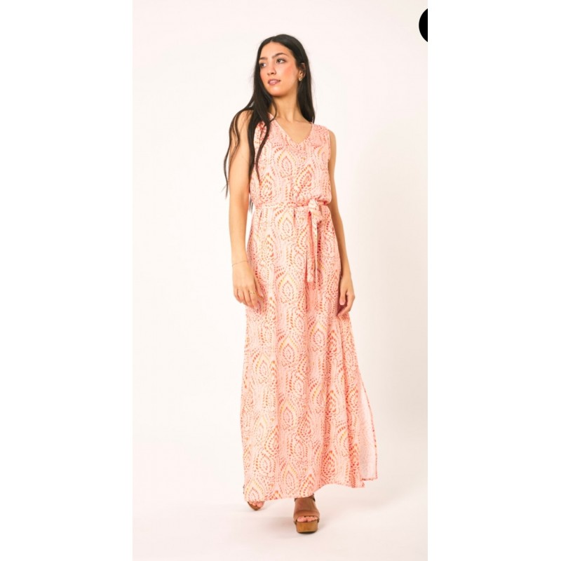 Vestido de tirantes largo en los que predominan los tonos en naranja y blanco.