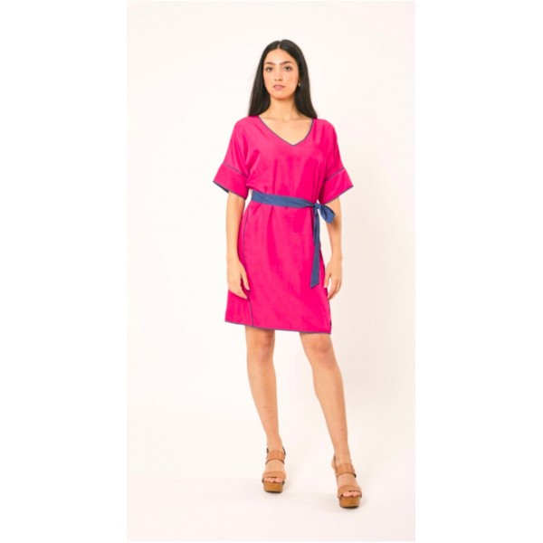 Vestido corto de manga corto en color rosa fucsia con detalles en color azul.