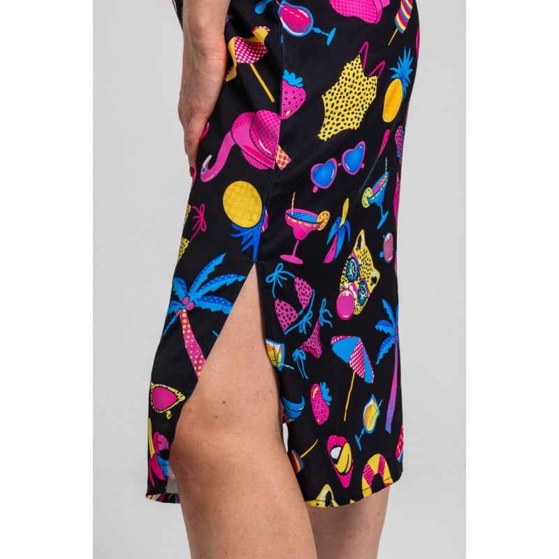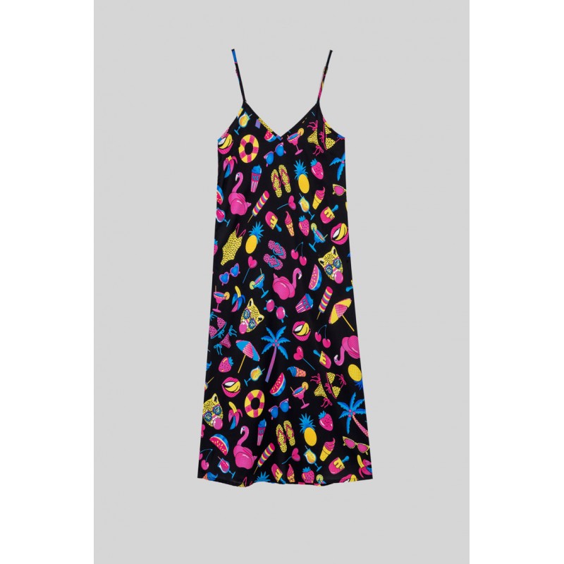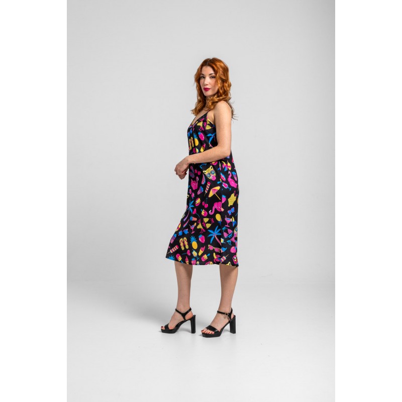 Summer time: y a gozarla - Vestido lencero negro con estampado veraniego: Vestido lencero midi de tejido fluido de estampado vectorial. Escote pico en pecho y espalda y tirantes finos ajustables. Detalle de aberturas en los laterales. - 100% Poliéster. - Lavar a máquina en agua fría. No usar blanqueador. No usar secadora. Secar colgado a la sombra. Planchado a temperatura baja, por debajo de 100 ºC. Planchar del revés. No dejar la plancha parada sobre la prenda. Lavar con colores similares. - TALLA XS: Medida de pecho 42 cm, medida de la cintura 46.5 cm, medida de la cadera 47 cm y largo del cuerpo 106.5 cm.TALLA S: Medida de pecho 44 cm, medida de la cintura 48.5 cm, medida de la cadera 49 cm y largo del cuerpo 108 cm.TALLA M: Medida de pecho 46 cm, medida de la cintura 50.5 cm, medida de la cadera 51 cm y largo del cuerpo 109.5 cm.TALLA L: Medida de pecho 48 cm, medida de la cintura 52.5 cm, medida de la cadera 53 cm y largo del cuerpo 111 cm.TALLA XL: Medida de pecho 50 cm, medida de la cintura 54.5 cm, medida de la cadera 55 cm y largo del cuerpo 112.5 cm. - Las medidas de las prendas pueden presentar pequeñas variaciones debido al proceso de producción de hasta 2 cm. - Lolina ha realizado un gran esfuerzo para mostrar los colores de las prendas de la forma más cercana a la realidad posible. No obstante, queremos que tengas en cuenta que el color de las prendas que aparecen en pantalla puede estar sujeto a variaciones dependiendo de la calidad de tu ordenador o smartphone.