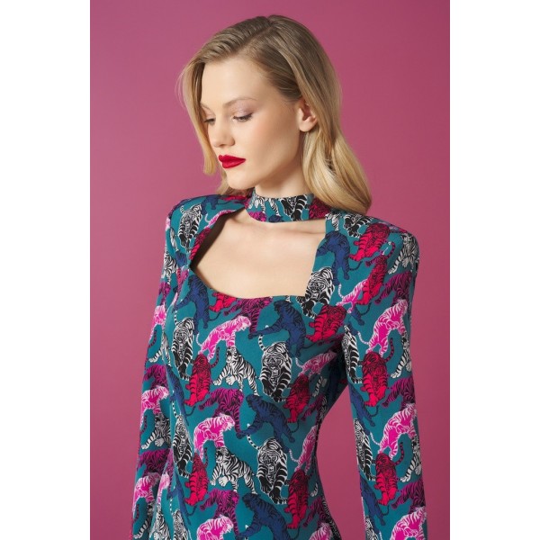 Vestido mini de manga larga, cuello redondo y escote cuadrado. Forro interior.